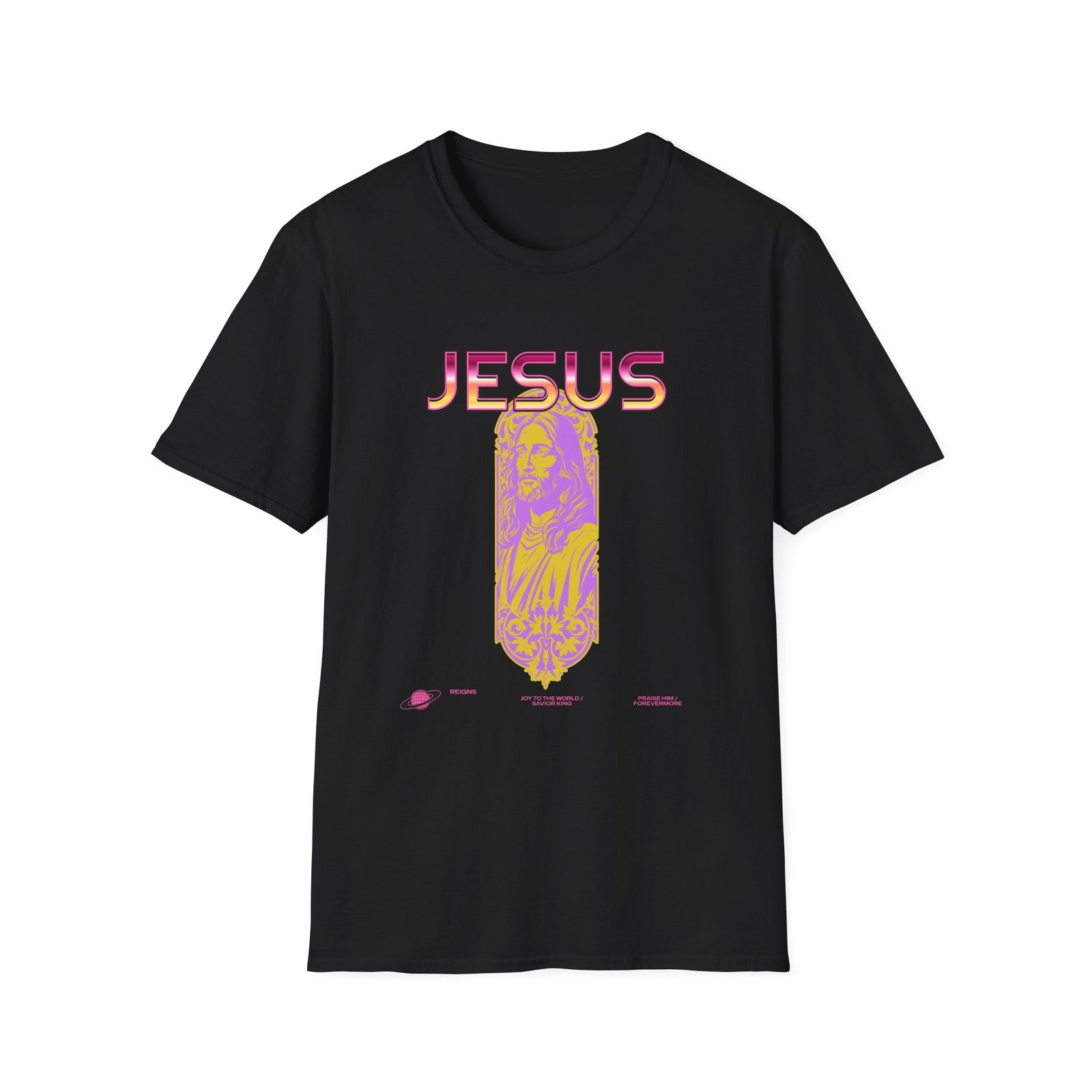 A lightweight, soft cotton tee with a bold, retro-futuristic design that puts faith-forward expression into everyday wear. The black shirt features a vivid pink-and-gold graphic with large “JESUS” lettering above an ornate vertical emblem, giving worshipful messaging a modern, streetwear edge. Wear it to church gatherings, youth meetups, concerts, or casual days when you want your faith to be clear but stylish. The fabric feels smooth against skin, the crew neck holds its shape, and the tubular knit construction keeps the silhouette clean. Built to last through frequent washes and comfortable enough for long days of fellowship and outreach.